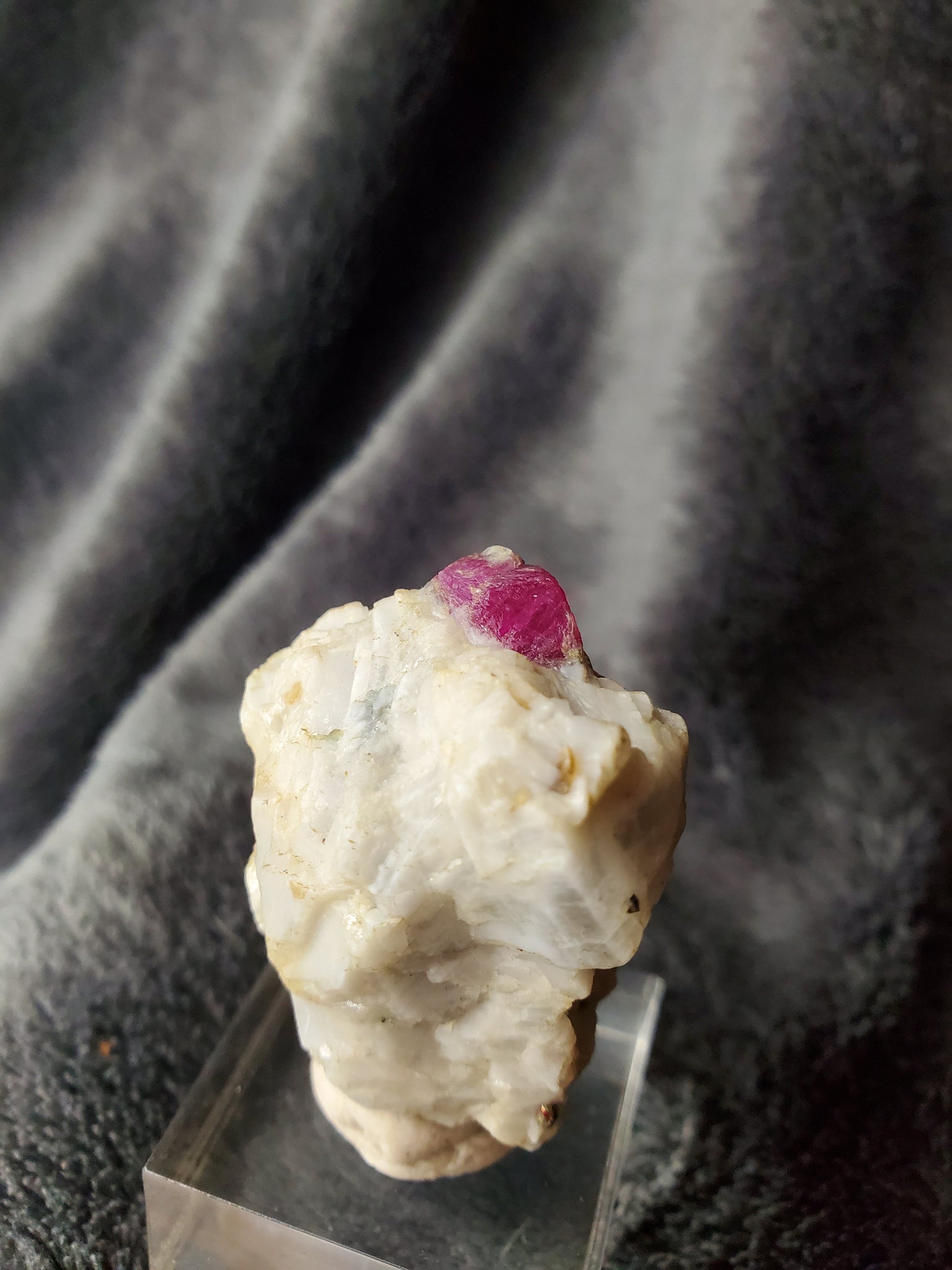 Ce spécimen de Rubis sur Calcite soupoudré d'un peu de Pyrite et de Muscovite en association est parfait pour un début de collection.