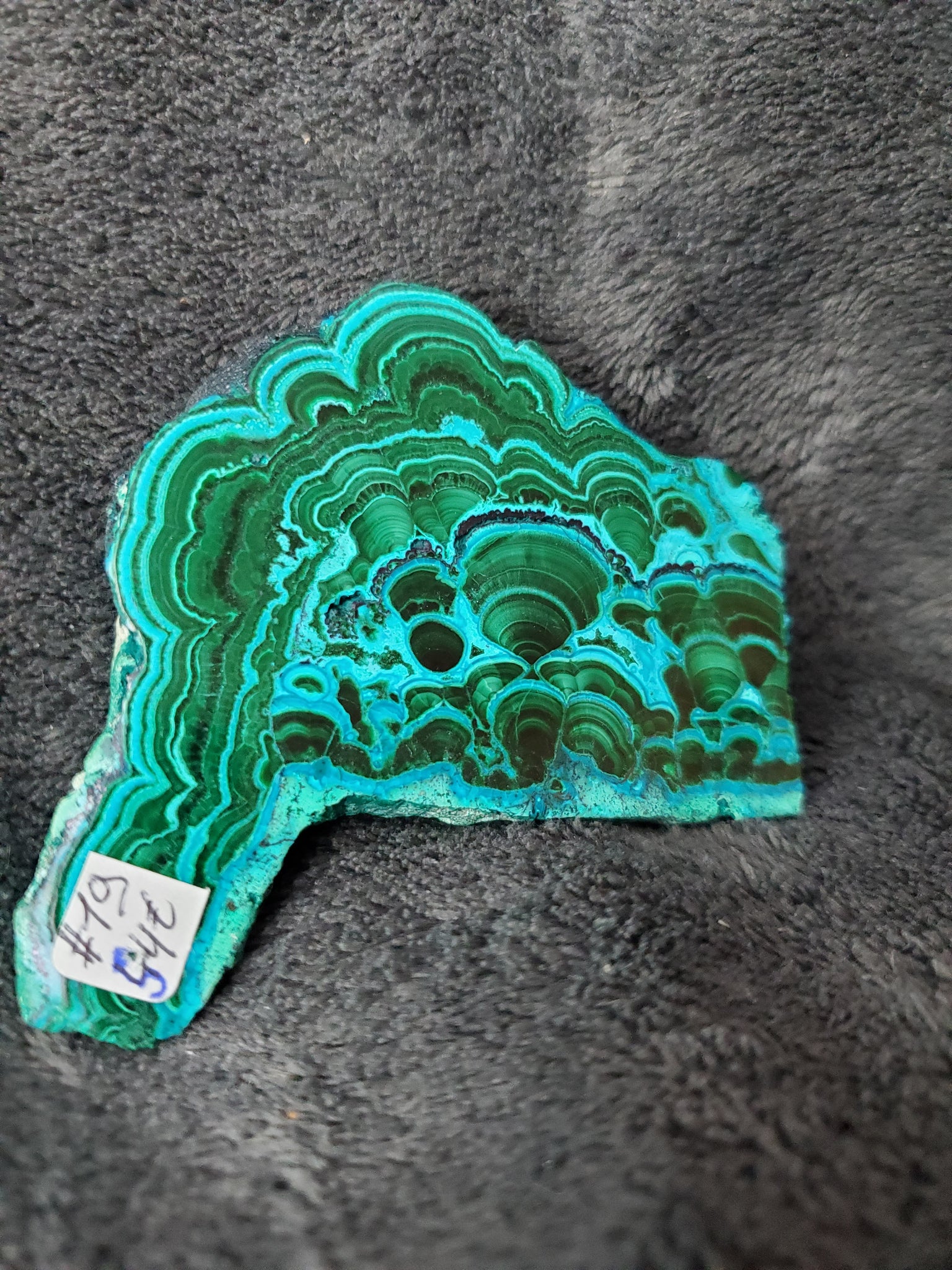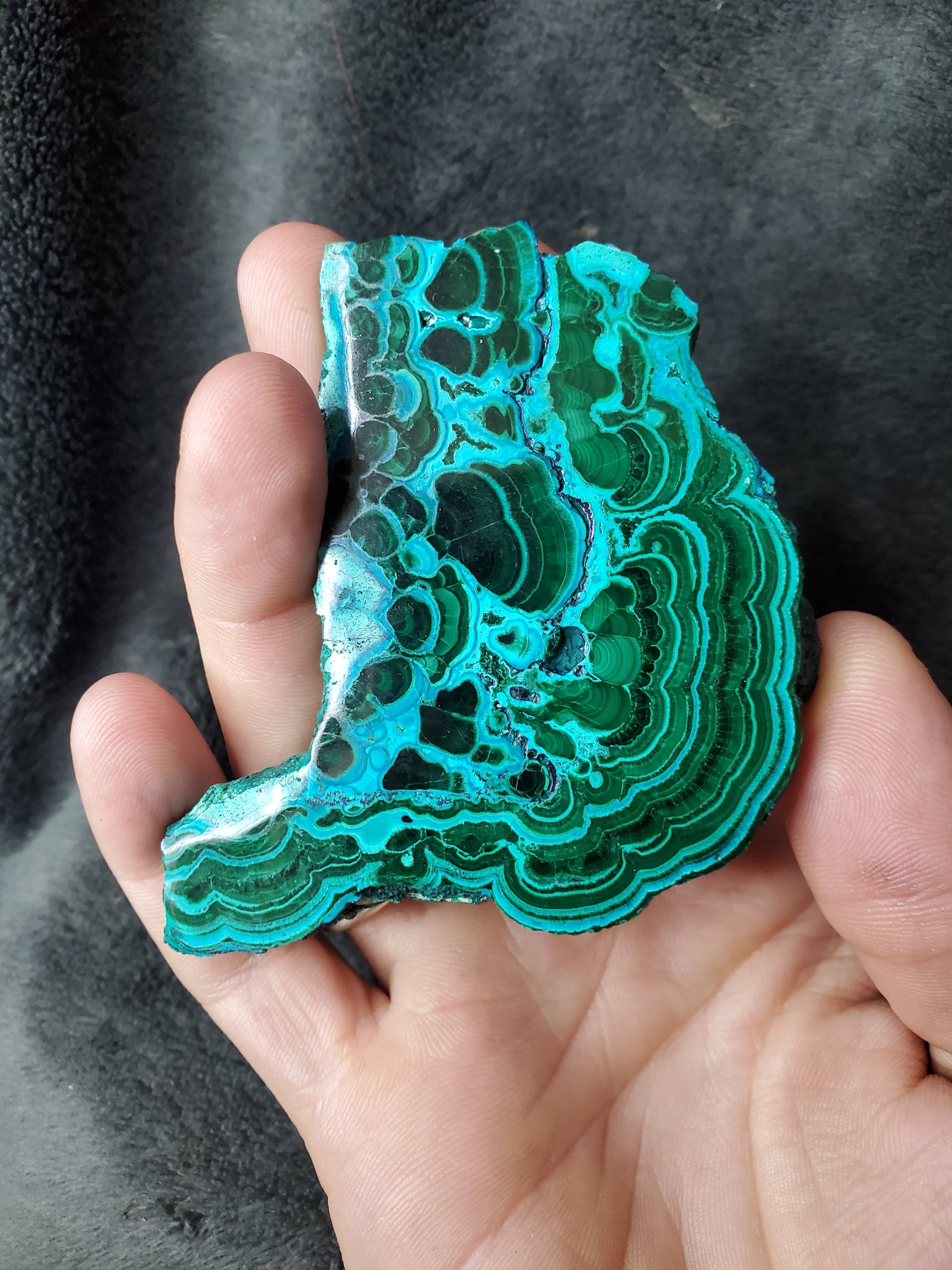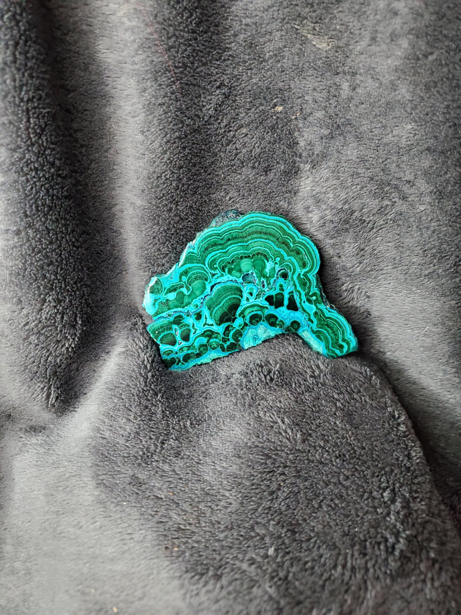 Cette pièce d'une qualité exceptionnelle, présente une partie de Malachite chatoyante et des dessins absolument sublimes dans leurs subtilités (à voir à la loupe c'est un vrai bonheur).