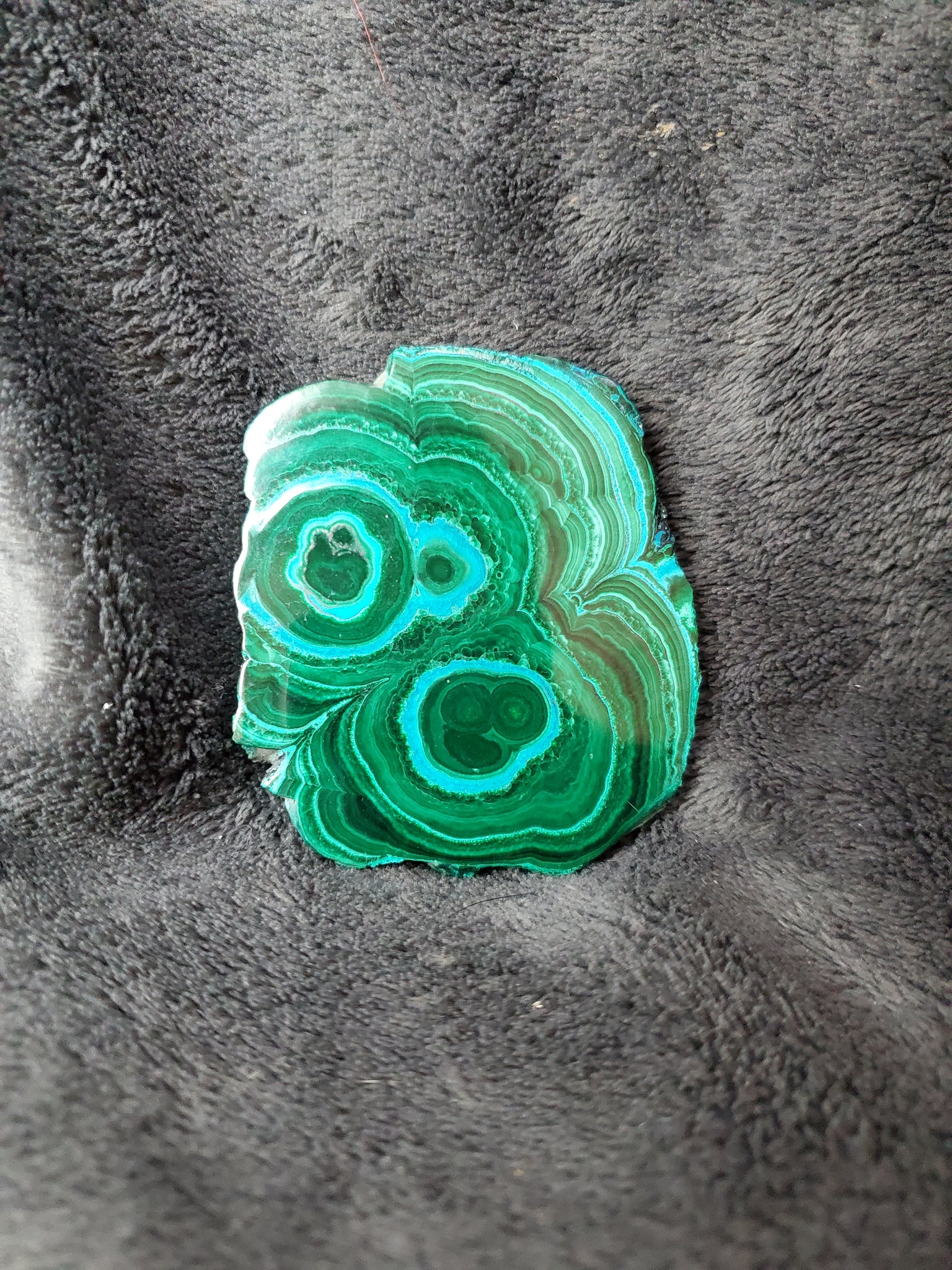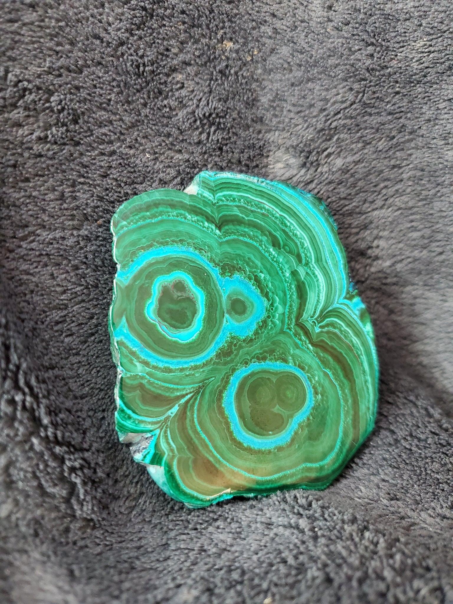 Cette pièce d'une qualité exceptionnelle, présente une partie de mélange Chrysocolle Malachite qui forment des dessins d'yeux voir même de visages absolument sublimes et qui nous rappelle bien l'idée de stalactite de base.