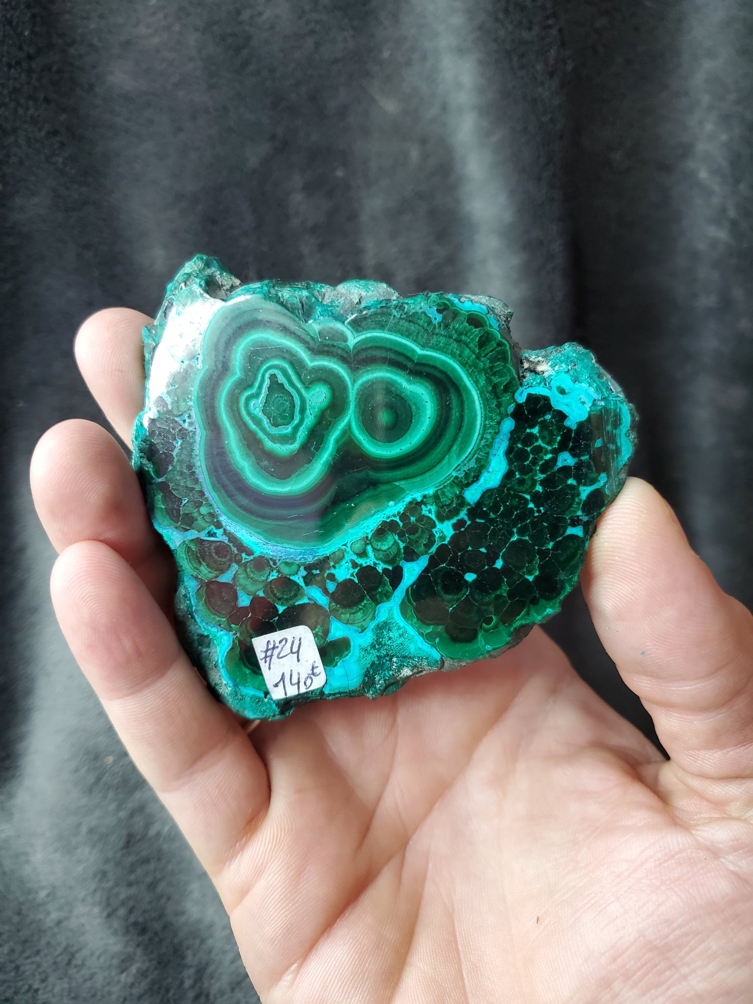 Cette pièce d'une qualité exceptionnelle, présente une partie Malchite fibreuse très appréciable ainsi que des dessins très graphique (on peut même croiser un visage dans le décor).