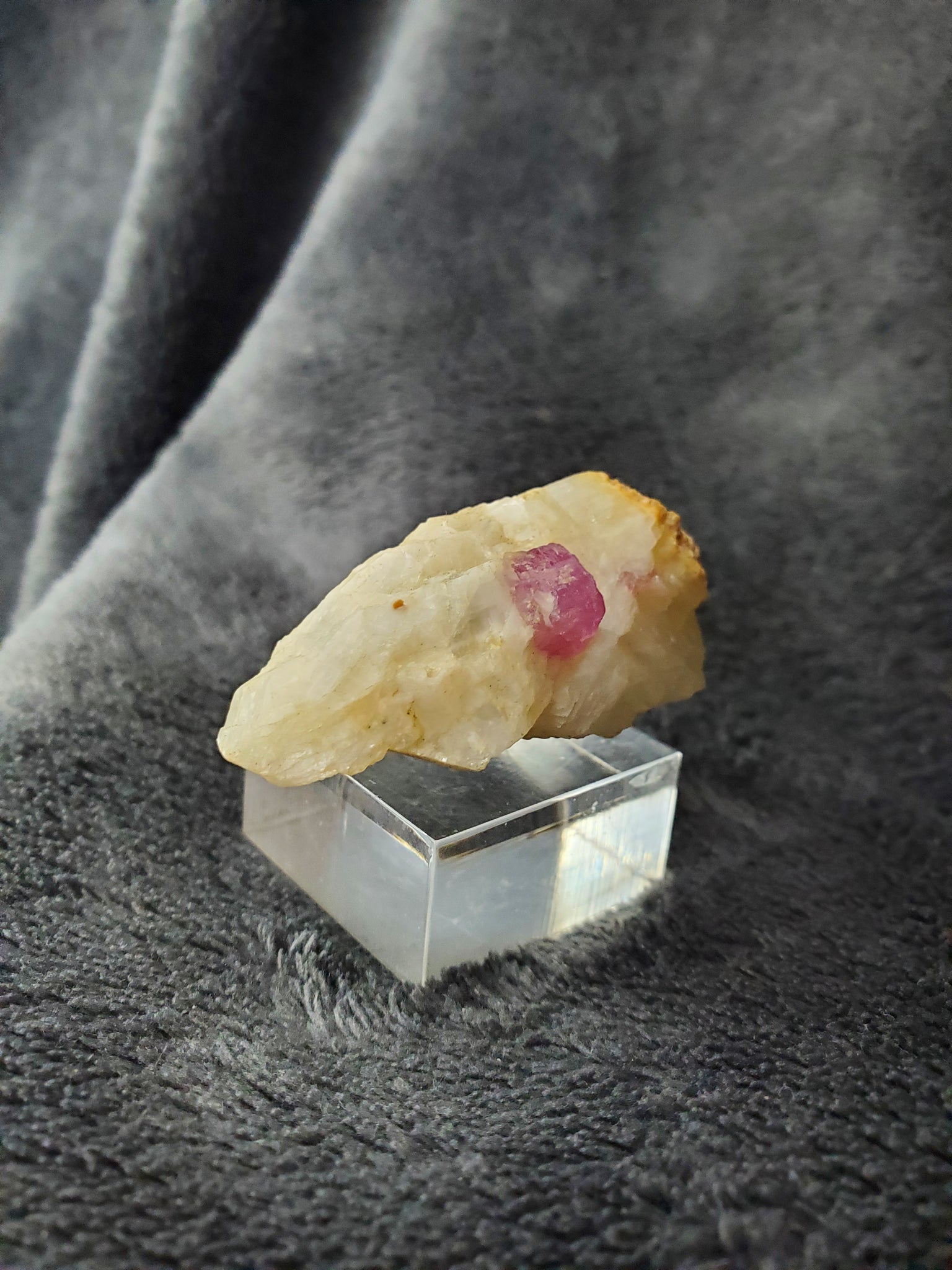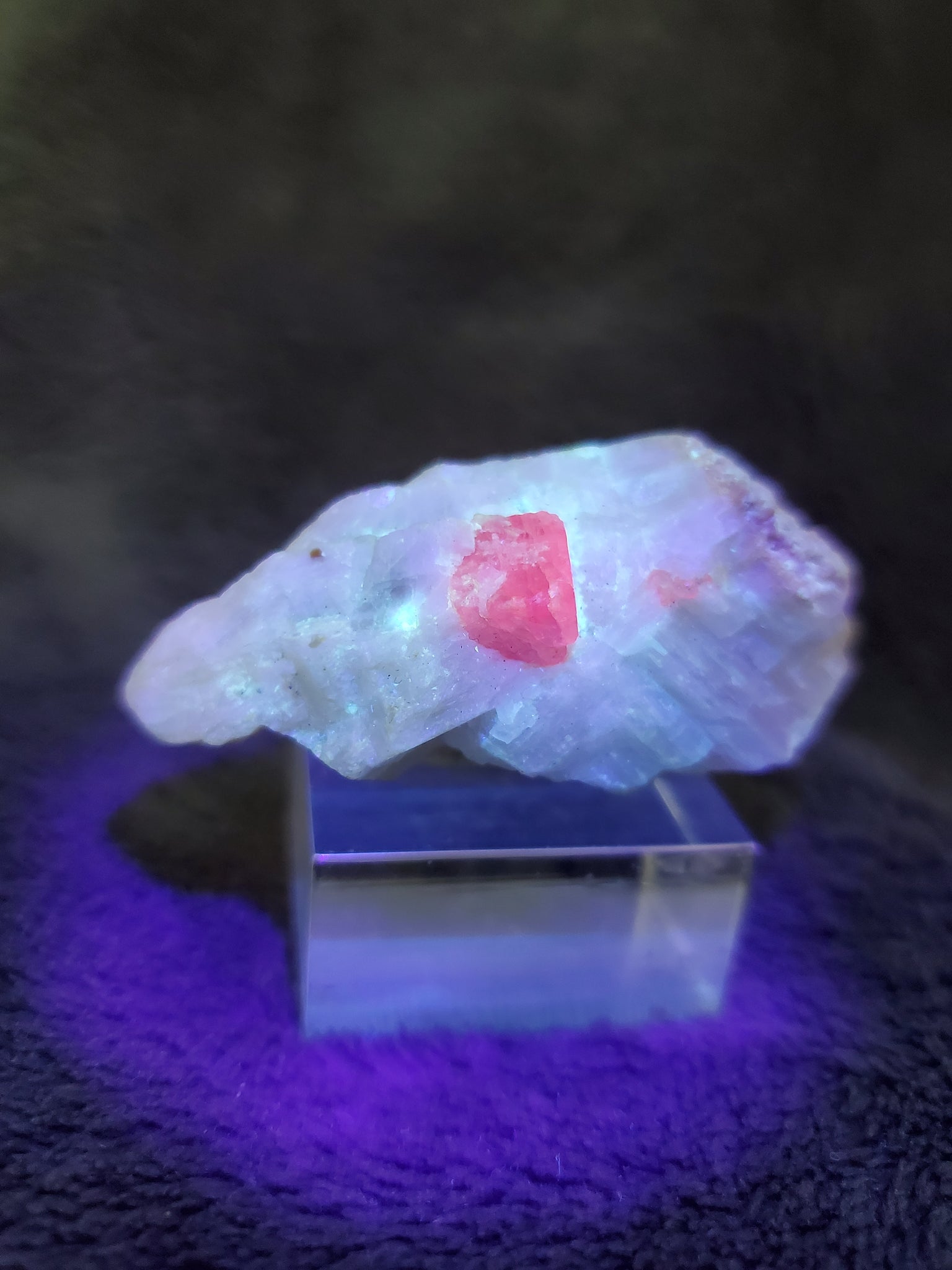 Ce spécimen de taille modeste possède un beau cristal de Spinelle posé sur sa matrice de Calcite. La pierre présente une belle fluorescence aux UV (voir photo).