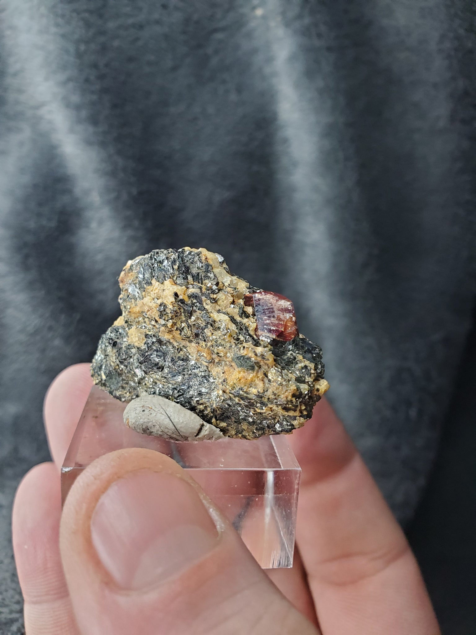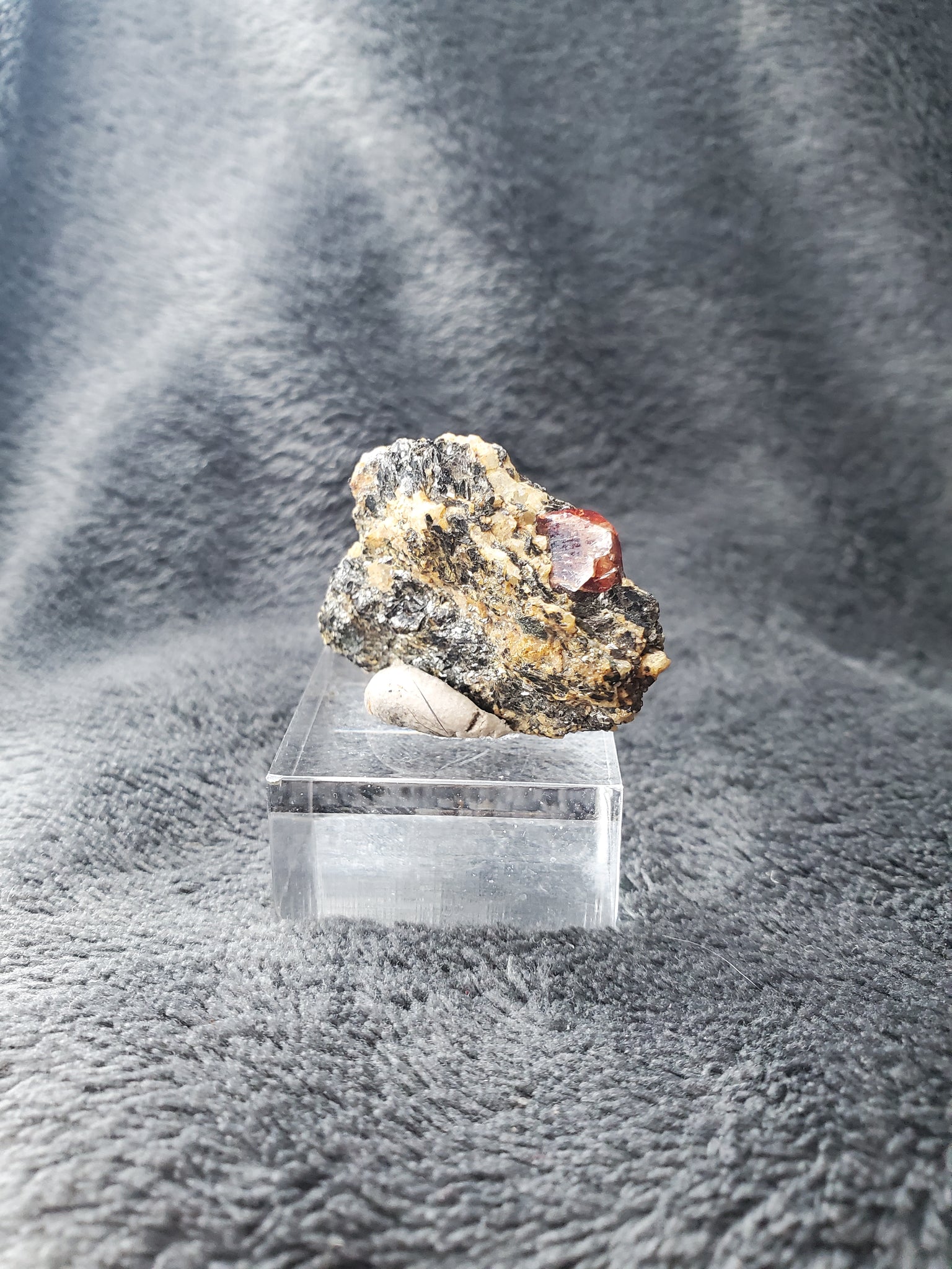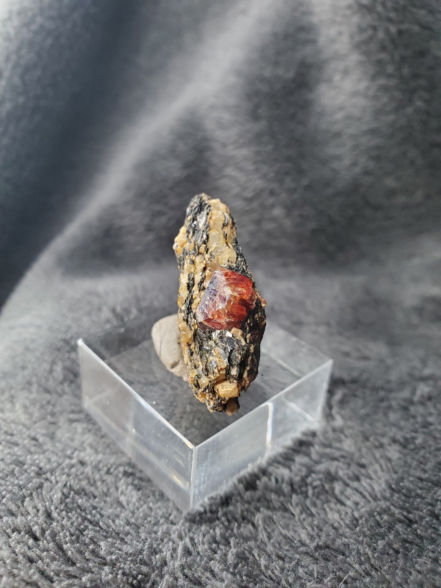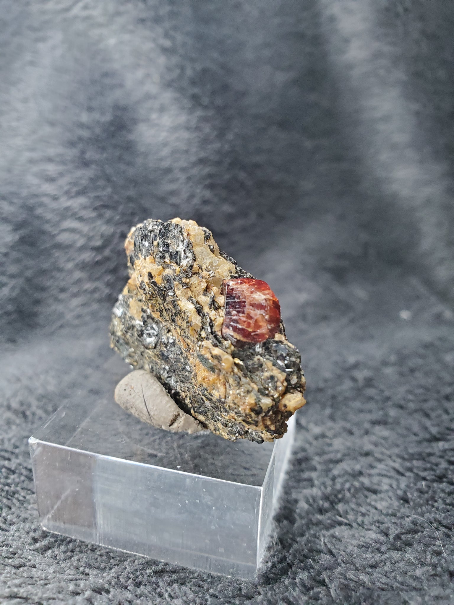 Ce spécimen provient du Pakistan et nous offre un joli cristal avec une belle couleur (difficile à rendre en photo) posé sur sa matrice de mica variété Biotite.